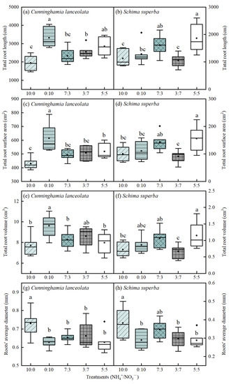 The roots’ parameters were significantly influenced by the different N forms in each treatment (p < 0.05) (Figure 1). Under the five different ratios of the N forms, the TRL and TRSA of C. lanceolata followed the order 10:0 < 7:3 < 3:7 < 5:5 < 0:10 (Figure 1a,c). Under the NO3−-N-only treatment, the TRL and TRSA were 16.54–70.42% and 18.58–42.68% higher, respectively, than those under the other four treatments. The TRV followed the order 10:0 < 5:5 < 7:3 < 3:7 < 0:10 (Figure 1e). It was largest under the NO3−-N-only treatment, which was 11.48–24.64% larger than that under the other four treatments. The RAD of C. lanceolata followed the order 5:5 < 0:10 < 7:3 < 3:7 < 10:0 (Figure 1g), and was significantly larger under the NH4+-N-only treatment than under the other four treatments. In general, the roots of C. lanceolata preferred to grow under the treatments with higher NO3−-N concentrations.