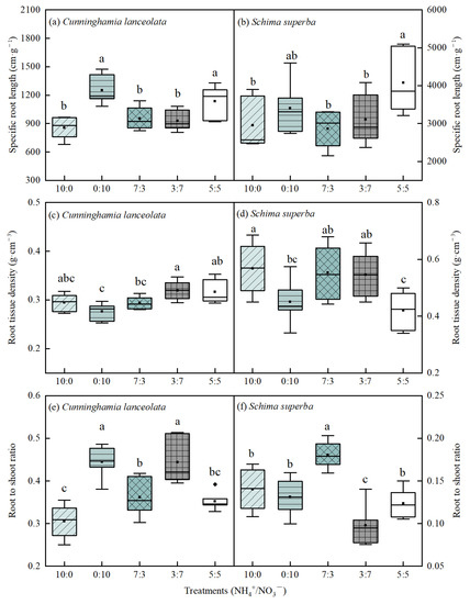 Effects of different NH4+-N and NO3−-N ratios on SRL (a,b), RTD (c,d) and RSR (e,f) between the two tree species. Different lowercase letters indicate that the SRL, RTD and RSR were significantly different under different N forms (p < 0.05).