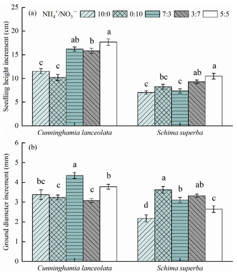 The ΔGD of C. lanceolata followed the order 7:3 > 5:5 > 10:0 > 0:10 > 3:7 and was largest at the ammonium to nitrate ratio of 7:3 (Figure 4b), which was 15.09–41.26% larger than that under the other treatments. The ΔGD of S. superba followed the order 0:10 > 3:7 > 7:3 > 5:5 > 10:0 (Figure 4b). It was largest at an ammonium to nitrate ratio of 0:10, which was 8.92–66.51% larger than that under the other treatments. Overall, C. lanceolata tended to increase the ground diameter of the seedlings under the treatment with a high NH4+-N concentration and a homogeneous N supply, whereas S. superba preferred to increase the ground diameter under the treatment with a high NO3−-N concentration.