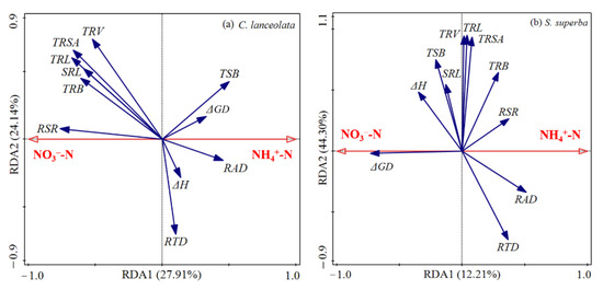 Redundancy analysis of the responses of roots’ morphological and growth parameters to different ratios of the N forms. The proportions explained by Axis 1 and Axis 2 in (a) are 27.91% and 24.14% and those in (b) are 12.21% and 44.30%, respectively. Solid blue lines indicate the parameters. Solid red lines indicate NH4+-N and NO3−-N. Abbreviations for the parameters are as follows: TRL, total root length; TRSA, total root surface area; TRV, total root volume; RAD, roots’ average diameter; TRB, total root biomass; TSB, total seedling biomass; SRL, specific root length; RTD, root tissue density; RSR, root-to-shoot ratio; ΔH, height increment; ΔGD, ground diameter increment.