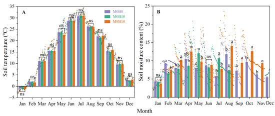 Daily (point) and monthly (histogram, mean ± SE) average soil temperature (A) and moisture content (B) in the unamended M0B0, 10 Mg ha−1 of biochar (M0B10), and high rate of both manure and biochar (M9B10) treatments at 10 cm depth in 2019. Different letters at the same date indicate significant differences between treatments (p ≤ 0.05); ns, not significant. Soil moisture data (from 10 September to 16 December) in M0B10 was lost due to instrument failure.