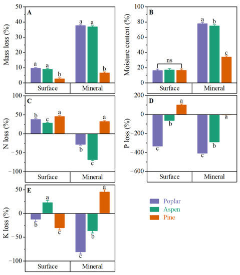 The mass loss (A), moisture content (B), and nitrogen (N) (C), phosphorus (P) (D), and potassium (K) (E) loss (means ± SE) of surface and mineral stakes with all soil treatments combined. Different letters at the same location indicate significant differences between species (p ≤ 0.05); ns, not significant.