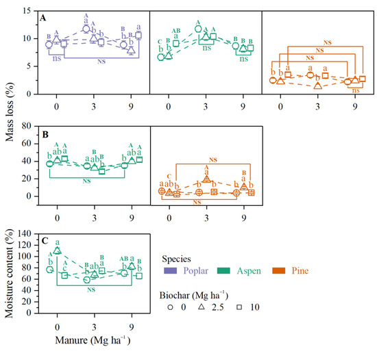 The surface (A) and mineral (B) stake mass loss and mineral stake moisture content (C) (means ± SE) as affected by soil amendments. Different lowercase letters indicate significant differences among biochar at each manure rate, capital letters indicate significant differences among manure at each biochar rate (p ≤ 0.05), and NS indicate no significant differences among manure at each biochar rate.