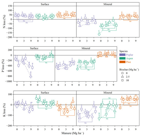Nitrogen (N), phosphorus (P), and potassium (K) loss from surface and mineral stakes (means ± SE). Different lowercase letters indicate significant differences among biochar at each manure rate, and ns indicate no significant differences; different capital letters indicate significant differences among manure at each biochar rate (p ≤ 0.05), and NS indicate no significant differences.