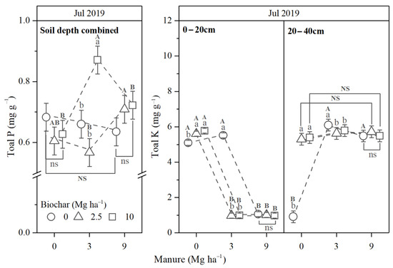Soil phosphorus (P) and potassium (K) contents as affected by soil treatments (means ± SE). Different lowercase letters indicate significant differences among biochar at each manure rate, and ns indicate no significant differences; different capital letters indicate significant differences among manure at each biochar rate (p ≤ 0.05), and NS indicate no significant differences.