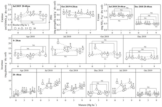 Soil catalase, polyphenol oxidase (PPO), urease, and invertase activity as affected by soil treatments (means ± SE). Different lowercase letters indicate significant differences among biochar at each manure rate, and ns indicate no significant differences; different capital letters indicate significant differences among manure at each biochar rate (p ≤ 0.05), and NS indicate no significant differences.