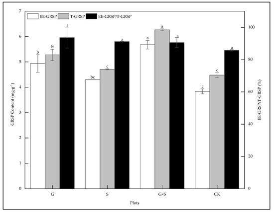 The EE-GRSP and T-GRSP contents differed among the three vegetation types. EE-GRSP and T-GRSP contents were highest in G×S (5.68 and 6.27 mg·g−1, respectively), followed by G and S; the smallest was in CK (3.84 and 4.48 mg·g−1, respectively). Significant differences were found between G×S and other vegetation types (p < 0.05), whereas the ratios of EE-GRSP and T-GRSP were not significantly different between all types (p > 0.05), with a mean value of 90.33% (Figure 1).