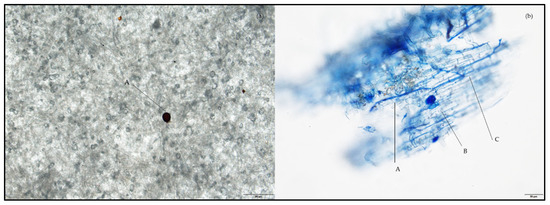 (a) Magnification of AMF soil spores and (b) colonization infection. In panel (a), A designates spores (4×, 200 μm); In panel (b), A designates vesicles; B, hyphae; and C, arbuscules (20×, 50 μm).