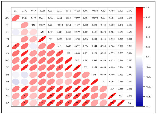 Pearson correlation analysis between GRSP and environmental factors. EEG, EE-GRSP; TG, T-GRSP; E/S, EE-GRSP/SOC; T/S, T-GRSP/SOC; SD, spore density; CR, colonization rate; SA, species abundance. The same below. *, p < 0.05; **, p < 0.01.