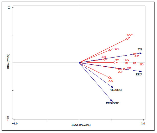 EE-GRSP, T-GRSP, EE-GRSP/SOC, and T-GRSP/SOC were used as response variables, and soil physicochemical properties, colonization rate, spore density, and species abundance were used as explanatory variables to perform RDA on two sets of data. The results showed that Axis 1 explained 95.23% of the differences in GRSP characteristics, Axis 2 explained 2.91% of the differences in GRSP characteristics, for a cumulative explanation of 98.14%. EE-GRSP and T-GRSP were positively correlated with SOC, TN, pH, AK, TP, AP, species abundance, spore density, and colonization rate; EE-GRSP/SOC and T-GRSP/SOC were positively correlated with AN, AP, TP, colonization rate, species abundance, and spore density; and EE-GRSP/SOC was not correlated with SOC. Spore density (77.1% explained, p = 0.002) and AK (9.7% explained, p = 0.018) had a significant effect on EE-GRSP, T-GRSP, EE-GRSP/SOC, and T-GRSP/SOC. (Figure 4).