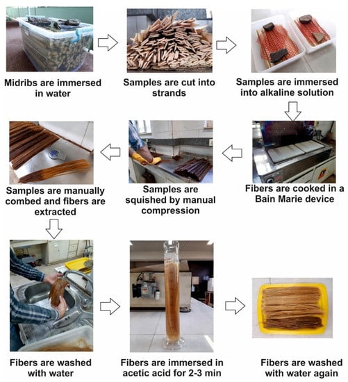 After seven days of immersion in water, the samples were cut manually into thinner strands with a knife or blade, and the outer skin of the midrib was removed from each strand, so to allow a better penetration of sodium hydroxide into the core. The fibres close to the outer skin of the midribs are stiffer fibres than the fibres of the middle parts, so when the samples were converted to strands, these fibres were removed. Then, the strands were immersed in an alkaline solution of sodium hydroxide 1.5% (ratio of 1:20 as strand: NaOH solution) and cooked in a Bain Marie device at a temperature of 95 °C for three hours. The NaOH solution was used for delignification. Then, the samples were squished by manual compression with rollers. During this process, the lignin and extracts that were softened during the cooking process were squished, and the fibres were separated. The fibres were afterwards separated with a metal comb with a very small distance between the teeth, and we performed this manual combing operation until all the waste was removed from the fibres. After extracting the fibres, in the last step, a neurulation of alkaline fibres with acetic acid (concentration of 5%) by immersion for 2–3 min was performed. First, the fibres were washed with water so that they were completely clean, and this operation was repeated after the immersion into the acid, so finally, the color of the fibres was brighter. The washing steps with water were conducted to produce cleanliness and further delignification.