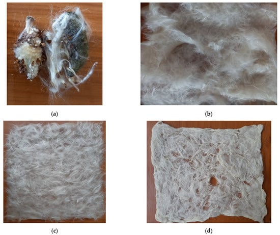 To provide the fibres needed for Calotropis sheets, the mature fruits (Figure 2a) were collected from Sistan and Baluchestan province (Iran), and the white silk (Papus fibres) were separated from the seeds (Figure 2b).