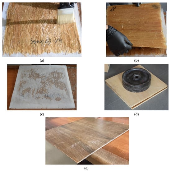 Composite manufacturing: (a) impregnation of the first layer with BK epoxy resin; (b) arrangement of middle date-palm layer; (c) composite covered by white silicone baking paper; (d) composite placed between two block board panels and pressed by two calibrated weights of 10 kg; (e) final composite panel.