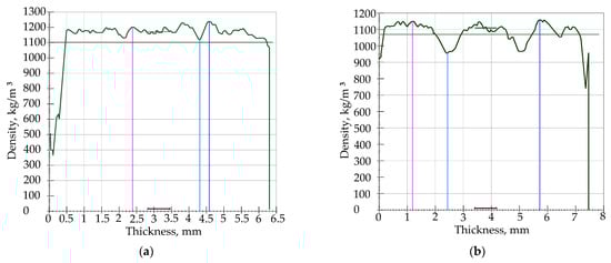 In Figure 4a–c, vertical density profile examples for each type of manufactured composites are presented.
