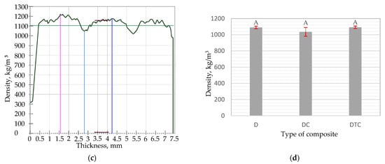 Vertical density profiles of the tested composites: (a) D; (b) DC; (c) DTC; (d) average values of measured densities.