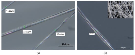The measurements of the fibres’ diameters reached values between 0.22 mm and 0.37 mm for the date palm, between 0.015 mm and 0.022 mm for the untreated Calotropis, and between 0.023 mm and 0.031 mm for the treated Calotropis. The measurements of untreated Calotropis are in line with the measurements recorded by other researchers based on SEM micrographs [20]. They also noticed that treating Calotropis with NaOH for 5 min at room temperature produces winding fibres. Other researchers observed that the treatment with NaOH significantly increased the diameter of the fibres [22], a fact revealed by microscopic investigation from the present research. As a first conclusion to the microscopic investigation, the Calotropis fibres have diameter sizes ten times smaller than those of the date-palm fibres. As seen in Figure 5a,b, the Calotropis fibre is transparent, and no visible transformation was noticed when comparing the treated one with the untreated one, except the increased diameter.