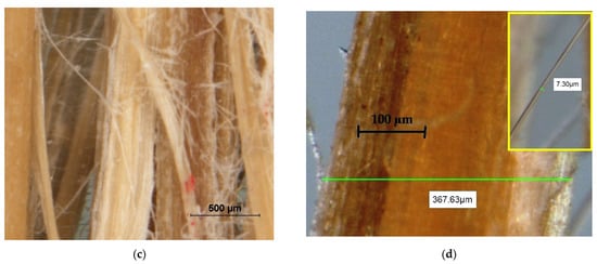 Microscopic investigation of the fibres: (a) untreated Calotropis fibres (240× magnification); (b) treated Calotropis fibre (240× magnification); (c) date-palm fibres (60× magnification); (d) measured bundle of date-palm fibres and the measured diameter of the single fibre in the detail image (240× magnification).