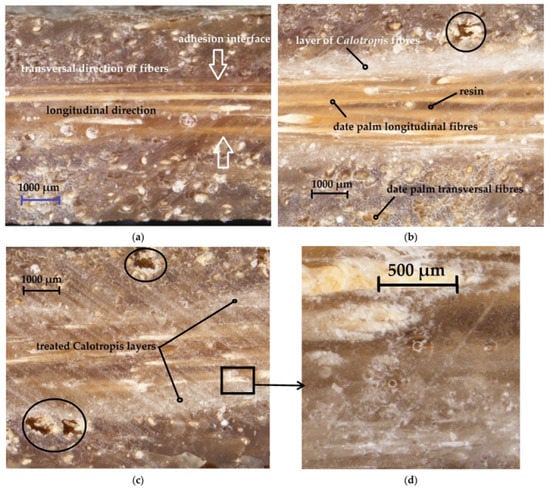 Microscopic investigation of the composite structures: (a) D (22.5× magnification); (b) DC (22.5× magnification); (c) DTC (22.5× magnification); (d) detail of the interface between date-palm layer and treated Calotropis layer (60× magnification) marked at (c) with black rectangle.