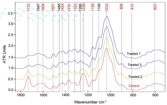 For the untreated Calotropis fibre (Control), the spectra (Figure 7) presented high absorptions bands at around 3330 cm−1, 2910–2800 cm−1, 1730 cm−1, and several peaks in the fingerprint region (presented in Figure 7), especially in the ranges 1640–1500 cm−1 and 1370–900 cm−1, indicating the presence of the main constituents of lignocellulosic natural materials such as cellulose, hemicelluloses, and lignin, in good accordance with the literature [39]. The high and broad absorption with a maximum at around 3330 cm−1 is assignable to H-bonded hydroxyl (-OH) groups in alcohols (cellulose, hemicelluloses) and phenols (lignin), while absorption at 2910 cm−1 is assigned to C-H stretching vibrations in methylene (-CH2-) and methyl (-CH3) groups in cellulose, hemicelluloses, and also possibly in waxes or oils, if present. The high absorption at 1730 cm−1 (unconjugated carbonyl) can be mainly associated with the acetyl groups in hemicelluloses and possibly also with other esters, such as waxes or oils, which might be present on the fibres [40]. Another absorption band is that at 1604 cm−1 (aromatic ring) with a shoulder at about 1645 cm−1, which might be assigned to conjugated carbonyl bonds or aromatic ketones in the structure of lignin, but also to O-H bending vibration for absorbed water [39,41]. The absorption at 1370 cm−1 is assigned to cellulose and hemicelluloses, while that at 898 cm−1 (C-H vibration) is characteristic of crystalline cellulose. The strong absorption at 1240 cm−1 might be assigned to the acetyl groups in hemicelluloses: 1255 cm−1 according to [41], 1230 cm−1 assignable to -C-C plus C-O plus C=O stretch for acetyl in xylan according to [41], and also to the syringyl ring in the structure of lignin, 1235 cm−1 syringyl ring in lignin, and C-O stretch in lignin and xylan, according to [42,43]. The absorption at 1507 cm−1 is the most characteristic absorption of lignin (aromatic skeletal vibration).