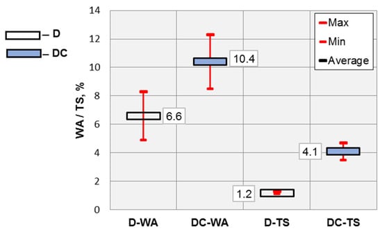The recorded values for the water absorption (WA) and thickness swelling (TS) are presented in Figure 8 for the D and DC composites investigated.