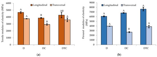 The mechanical strength values recorded for the three-layer laminate (D) tested on the longitudinal direction are higher (flexural strength was 1.5 times higher and the tensile strength was 1.2 times higher) than those recorded in another study [28] for panels manufactured with 50:50 as weight ratio of date-palm fibres to epoxy resin, using date-palm fibres from different parts of the plant. As regarding the flexural modulus of elasticity, with the better interfacial adhesion and dispersion of fibres and matrix, there are better flexural modulus results [29]. As found in the literature [28,30,31,32], alkali treatment applied to natural fibres improves the adhesion between the fibres and matrix, improving the mechanical performance of the resulted composite. The results obtained in this research confirm that the chemical treatment applied to the Calotropis fibres led to the increase of the mechanical characteristics of the composite material DTC compared with the ones of the composite DC. In Figure 9a, it is shown that the chemical treatment of the Calotropis fibres led to a tensile modulus of elasticity 10.66% and 22.95% higher than the one corresponding to the composite DC containing untreated Calotropis fibres in longitudinal and transversal directions of the fibres, respectively. Figure 9b,d show that the chemical treatment of the Calotropis fibres has increased the flexural modulus of elasticity by 12.1% and the flexural strength by 15% for the DTC composite compared to DC composites.