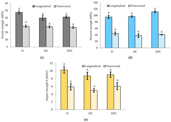 Comparison of the mechanical properties for the tested composite materials (variables with the same letter mean that the difference is not statistically significant): (a) tensile modulus of elasticity; (b) flexural modulus of elasticity; (c) tensile strength; (d) flexural strength; (e) impact strength.