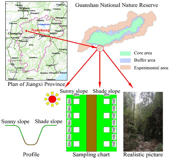 The Guanshan National Nature Reserve (28°30′–28°40′ N, 114°29′–114°45′ E) is located in the western part of the Jiuling Mountains in the northwest Jiangxi Province, China. It was one of the first national nature reserves in Jiangxi Province and belongs to the subtropical evergreen broad-leaved forest ecosystem. The mean annual temperature is 17.2 °C. The mean annual precipitation is 1680.2 mm. The total area is 11,500.5 ha, comprising 3621.1 ha in the core area, 1466.4 ha in the buffer zone, and 6413.0 ha in the experimental area. The soil type of this study area was typical red soil.