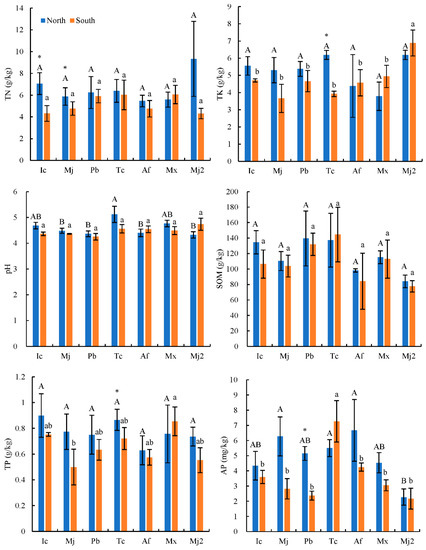 Soil chemical properties (AP, TK, SOM, pH, TP, and TN) in Tc natural forest in different aspects. The error line is the standard error. Data with different capital letters means significant difference in NF at p < 0.05. Data with different lowercase letters means significant difference in SF at p < 0.05; * means that there is significant difference between SF and NF. Abbreviations are as follows: Tc, Toona ciliates; Pb, Padus buergeriana; Mj, Maesa japonica; Mx, Melliodendron xylocarpum; Ic, Ilex chinensis; Af, Alniphyllum fortunei; Mj2, Mallotus japonicas.