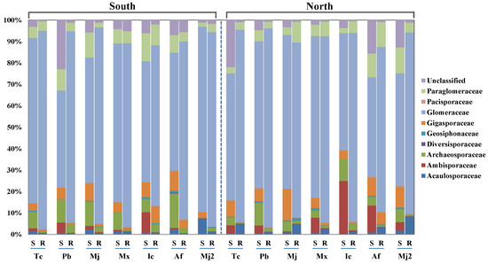 Similarly, Glomeraceae was the most common and abundant AM fungi group in the Tc natural forest root (Figure 3). The relative abundance of Glomeraceae in the Tc root was 92.68% in SF, and it was 90.10% in NF. Generally, the relative abundance of Acaulosporaceae differed significantly with aspect, being greater on NF than on SF (p < 0.05, Table A1 and Table A2, Figure 3). However, there was no significant effect of species on the relative abundance of Acaulosporaceae (p > 0.05, Table A2). In addition, the relative abundance of Archaeosporaceae showed significant differences among different species (p < 0.05, Table A1 and Table A2, Figure 3).