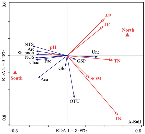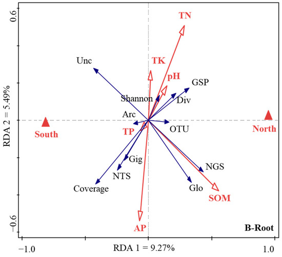 Firstly, the normal distribution test is carried out on all the data used in the analysis. If the data does not conform to the normal distribution, the natural logarithm or trigonometric function is used for data conversion. Secondly, the Duncan’s multiple comparative analysis (version 26.0; IBM, Armonk, NY, USA) was conducted to analyze the variations in soil chemical properties (pH, SOM, AP, TK, TP, and TN), soil and root AM fungi community diversity (the Chao, Shannon, Simpson, and coverage indices), and sequence parameters (the total sequence number, the number of Glomeromycota sequences, the proportion of Glomeromycota sequences, the number of OTUs, and the relative abundance of the belowground AM fungi community sequence) in Tc natural forest in different aspects. Pairwise comparative analysis was used to compare the difference of the corresponding value between the north and south aspects. Thirdly, there were, respectively, 18 response factors for AM fungal community characteristics in soil and root. Through factor analysis, 6 types of comprehensive factors (which mainly reflected the information of 11 key factors) were used to reflect the information of 18 response factors, so as to reduce the dimension, and the key response factors were determined for further analysis. Therefore, the redundancy analysis (RDA) was applied to analyze the relationships between soil environmental variables and the key characteristics of the AM fungal communities by using the standardized data (Canoco 5.0, Biometrics Wageningen, The Netherlands).