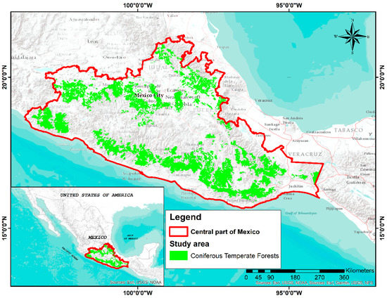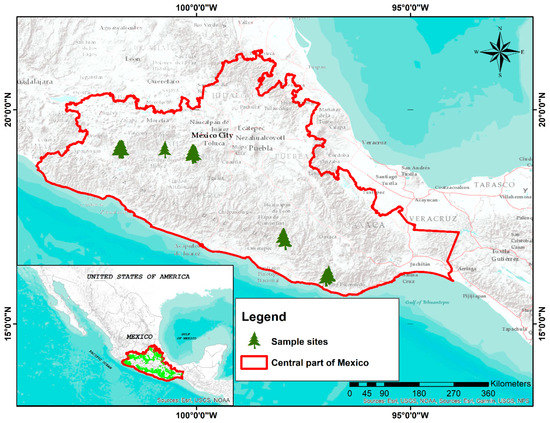 The study area was located within temperate forested regions in the central part of Mexico, composed mainly of the genus Pinus [8,18] but including fir, cedar, junipers, and other types of vegetation associated with coniferous trees. Mexican coniferous temperate forests are located primarily on high altitudes over mountainous zones originated by volcanos [8,19] (Figure 1).