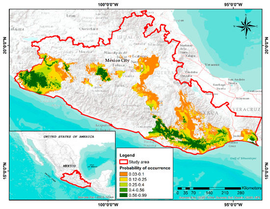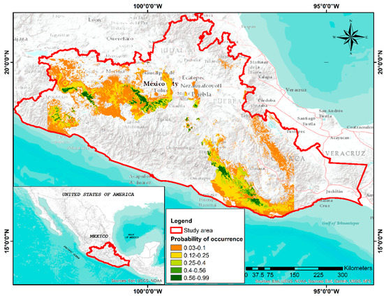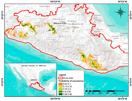 The model predicted a probability of occurrence where values close to 1 represent areas where the species has better chances of being present or established. The area with a probability higher than 56%, as was stated before, was classified as suitable for the development of plus trees of P. oocarpa. Those areas were located at high elevations and well distributed across the study area (Figure 3).