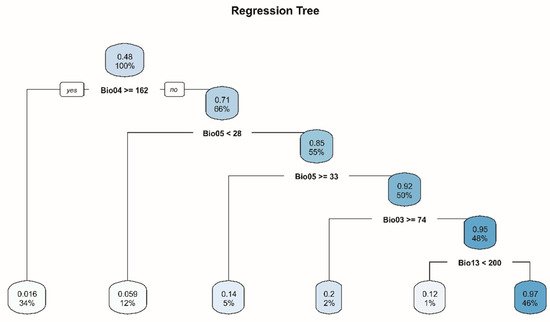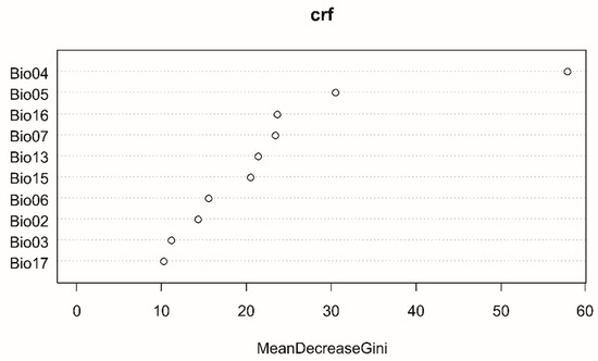 We used a bagging procedure for averaging the outputs of different CARTs (classification and regression trees) for the random forest modelling process. Bagging stands for “bootstrap aggregation”. An essential feature of random forests is the out-of-bag samples, which means that the prediction/fit for a specific data point is only derived from averaging trees that did not include this data point during tree growing [31]. Thus, the output of random forests is essentially cross-validated. Random forests estimate variable importance by a permutation procedure, which measures for each variable the drop in mean accuracy when this variable is permutated. For our case, the variable importance can be seen in Figure 3; Bio04, Bio05, Bio13, and Bio16 were the most important for modelling (Figure 4).