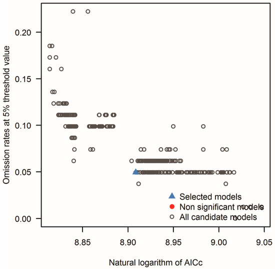 Figure 7 shows the position of the selected models in the distribution of all candidate models in terms of statistical significance, omission rates, and AICc values.