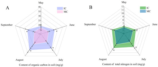 Effects on soil organic carbon (A) and total nitrogen contents (B) under different planting modes in different months. Each value is the mean value ± SE (n = 5). * Significant differences in different planting modes during these months (t-test, p < 0.05); MC, monoculture C. acuminata; IC, interplanted C. acuminata.