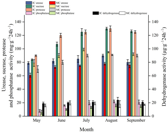 Effects on urease, sucrase, protease, and phosphatase (mg·g−1 24 h−1), dehydrogenase (μg·g−1 24 h−1) activities in soil under different planting modes at different months. Each value is the mean value ± SE (n = 5). MC, monoculture C. acuminata; IC, interplanted C. acuminata.