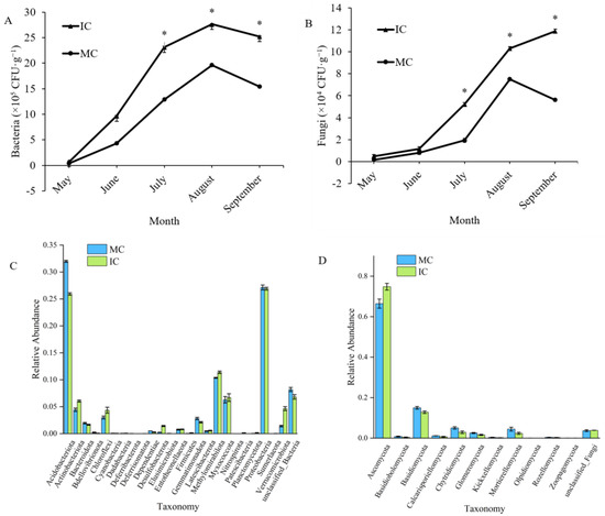 Effects on bacteria (A) and fungi (B) in soil under different planting modes at different months. * Significant (p < 0.05) differences in planting modes during these months (t-test). MC, monoculture C. acuminata; IC, interplanted C. acuminata. Relative abundance of bacterial (C) and fungal (D) communities at the phylum level, based on Illumina sequencing of the 16S rRNA gene and the ITS1 region from two plant modes (MC, monoculture C. acuminata; IC, interplanted C. acuminata). Each value is the mean value ± SE (n = 3).