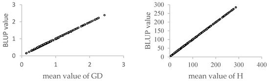 Mixed linear models for H and GD of ST were assessed using the ASReml-R package. The fixed effects in the model were block and environment, and the random effects were genotype and G × E. The variance components and significance of block, environment, genotype, and G × E were obtained following the analysis. The results are shown in Table 5 and Table 6. The ‘predict()’ function was used to extract the BLUP values in the model. By comparison, BLUP values were significantly correlated with the observed values of H and GD (Figure 1), and BLUP values were used to visualize the G × E. According to the results, the H and GD of ST were affected significantly by the environment and the G × E (p < 0.01), and the effect of the genotype was not significant.