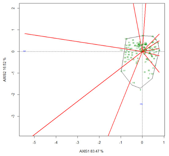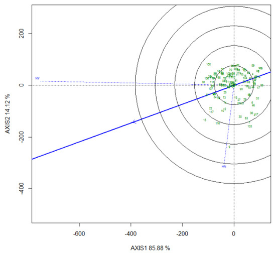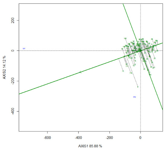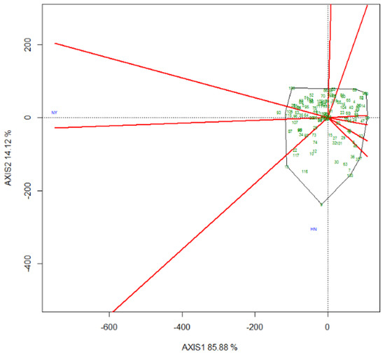 Figure 2, Figure 3 and Figure 4 display the H GGE-Biplots. According to Figure 2, NY had better representativeness and discrimination than HN, and the angle between the environmental vectors of the two sites was approximately 90°, indicating that the two environments were almost completely unrelated.