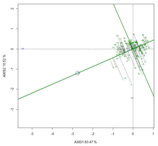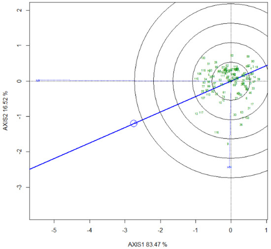 Discrimination and representativeness of H. The average environment axis is the blue solid line through the origin, and the dotted line is the environment vector of the two sites. The test area discrimination was measured based on the environment vector length. Site discrimination improves with longer dotted lines. The test site is represented by the angle between the dotted and the solid blue lines. The representativeness increases as the angle decreases. The angle between the two dotted lines—the site angles—can indicate a correlation [6].