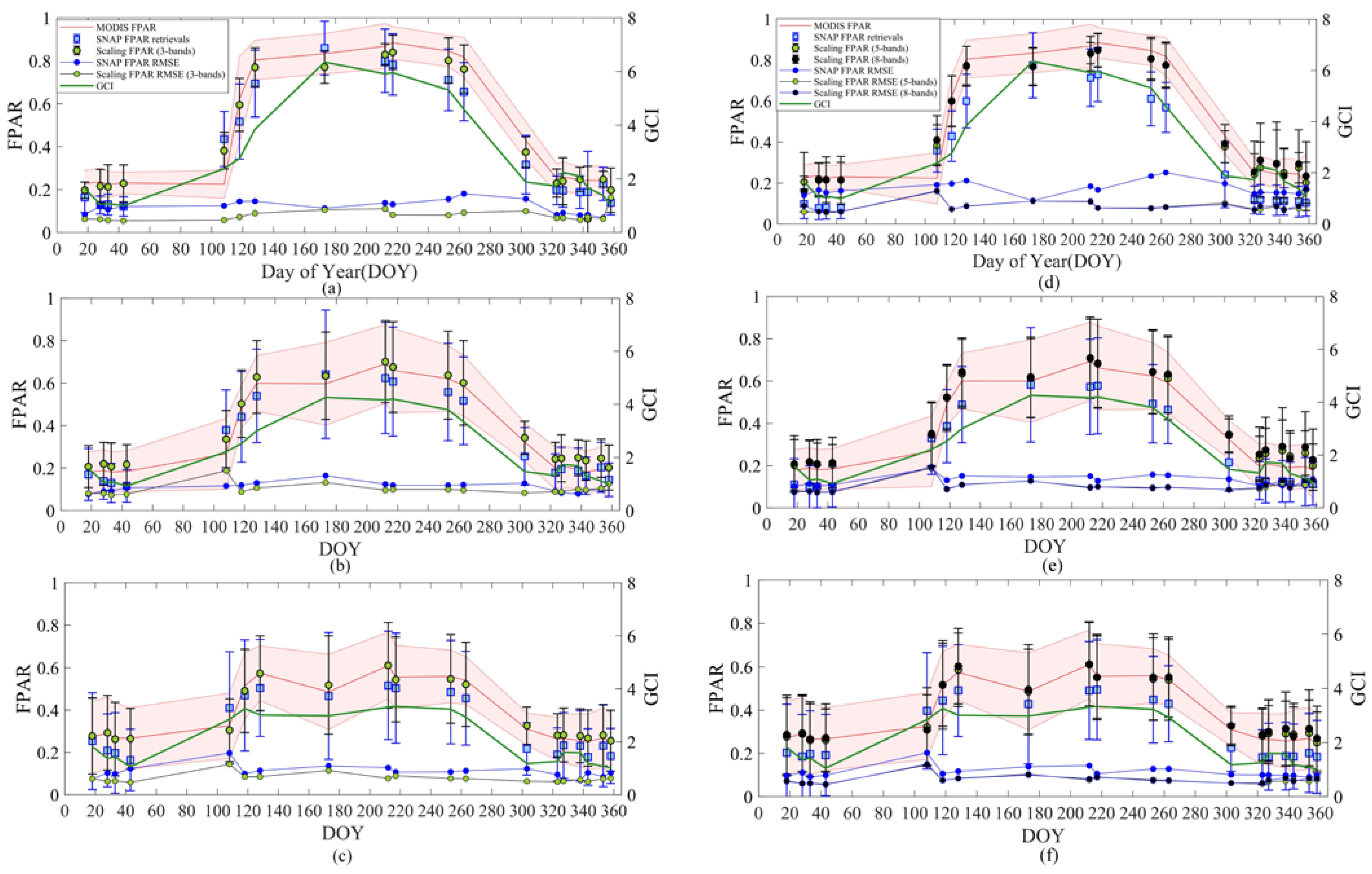 - Compared with MODIS FPAR products, the SNAP method systematically underestimated FPAR values, especially for densely vegetated and sparsely vegetated areas. Such underestimation by the SNAP method was more significant at 20 m resolution than at 10 m resolution. The scaling-based method using three, five, and eight bands all achieved very good consistency with the MODIS FPAR products compared to the SNAP method.