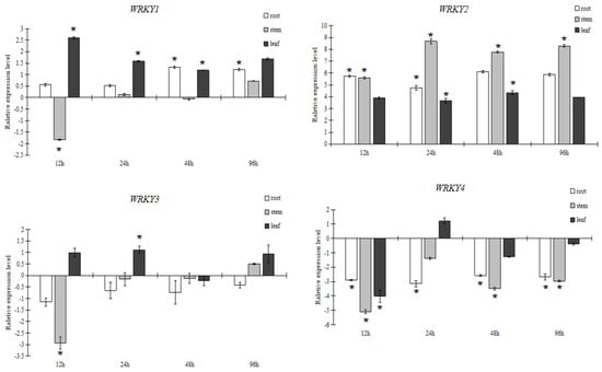 - Zhou, L.; Wang, N.N.; Kong, L.; Gong, S.Y.; Li, Y.; Li, X.B. Molecular characterization of 26 cotton WRKY genes that are expressed differently in tissues and are induced in seedlings under high salinity and osmotic stress. Plant Cell Tissue Organ Cult. 2014, 119, 141–156. [Google Scholar] [CrossRef]