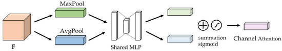 First, the given feature maps are used as inputs for global maximum pooling and mean pooling, respectively. The pooled two one-dimensional vectors are then fed into a shared Multi-Layer Perceptron (MLP). Then the two features’ output from the MLP are subjected to summation operation and sigmoid function activation operation. The feature maps of the final generated channel attention module are used as the input features required for the spatial attention module, i.e., the second part, as shown in Figure 6.