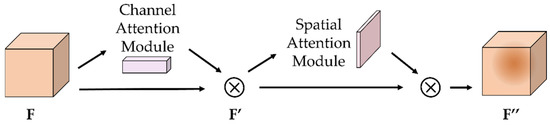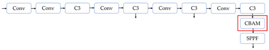 The CBAM attention mechanism module integrates the above two components. For the input feature maps, the CBAM module inferred the attention maps sequentially along both channel and spatial dimensions. The attention graph is then multiplied with the input feature graph to perform adaptive feature optimization. Its module structure is shown in Figure 7. Adding CBAM locations to the network is shown in Figure 8.