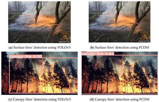 The detection effect of YOLOv5 and FCDM model for typical forest fire images. (a,b) Surface fires and (c,d) canopy fires.