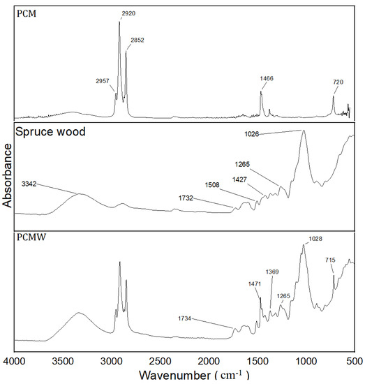 FTIR spectroscopy has been widely used to confirm whether the modification process has taken place successfully [33,34]. The FTIR spectra of nHD and the PCMW are shown in Figure 1. In the spectrum of pure n-HD (Figure 1 (PCM)), the peaks at 2957 cm−1, 2920 cm−1, and 2852 cm−1 conform with the symmetrical C–H stretching vibration of single-bond CH3 and single-bond CH2 groups, respectively. The peaks observed at 1363 cm−1 and 1466 cm−1 represent C–H deformation vibration bands [33,34].