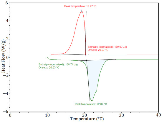Figure 3. Melting (green) and solidifying (red) DSC curves of the PCM-modified wood (PCMW).