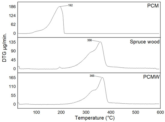 Figure 5. DTG of the PCM (n-HD)- and PCM-impregnated wood (PCMW).