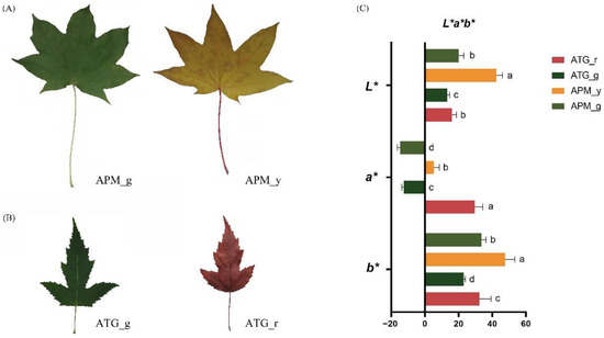 Leaves of two Acer L. species in different seasons and leaf colour parameters: (A) APM (green, summer; yellow, autumn); (B) ATG (green, summer; red, autumn); (C) leaf colour parameters. Different letters indicate significant differences in different tissues (p < 0.05).