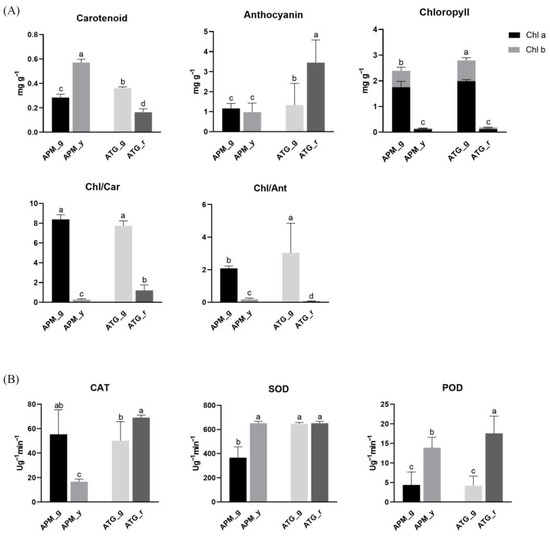 Pigment and antioxidant enzyme of APM and ATG leaves in different seasons: (A) pigment content and (B) antioxidant enzyme activity. Different letters indicate significant differences in different tissues (p < 0.05).